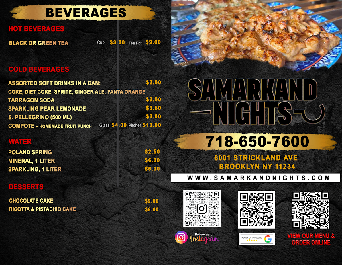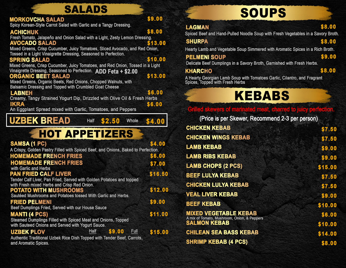 Welcome to Samarkand Nights, a hidden gem in the heart of Brooklyn, NY, specializing in authentic Uzbek cuisine. The inviting atmosphere and warm decor set the stage for a delightful culinary journey. Patrons rave about the signature Plov, a saffron-infused rice dish that perfectly melds flavors of tender beef and sweet carrots. Reviewers are particularly fond of the generous portions and skilled seasoning, evident in the delightful shashlik and hearty Lagman soup, filled with colorful vegetables and noodles.