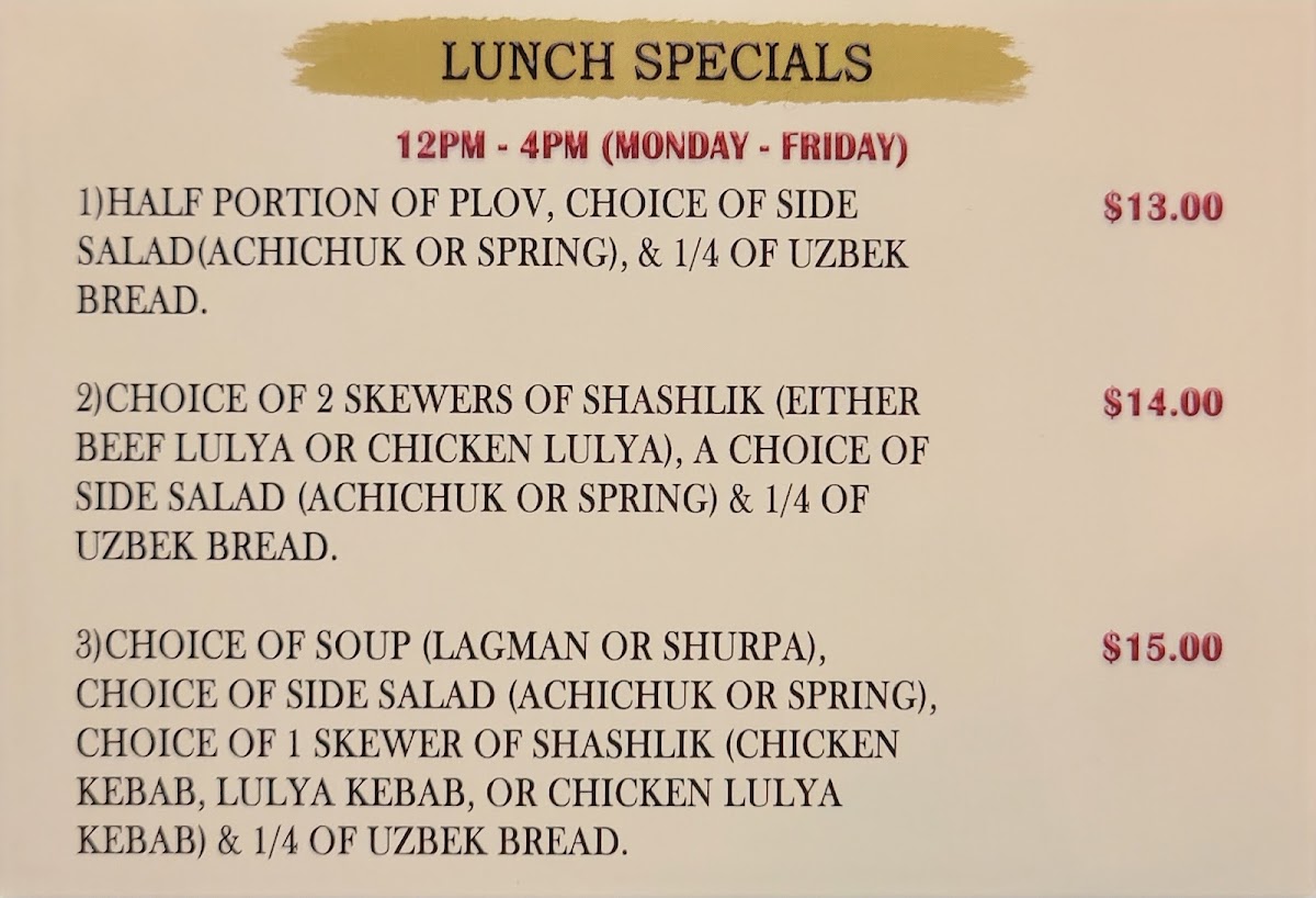 Customer favorites include the Lunch Specials, pairing achichuk salad with mouthwatering main dishes, further enhancing the experience. Many visitors appreciate Samarkand Nights for its dedication to quality and freshness, making it their go-to spot for Uzbek fare. Don’t miss out on the dessert recommendation; just ask for the Napoleon to wrap up your meal on a sweet note!